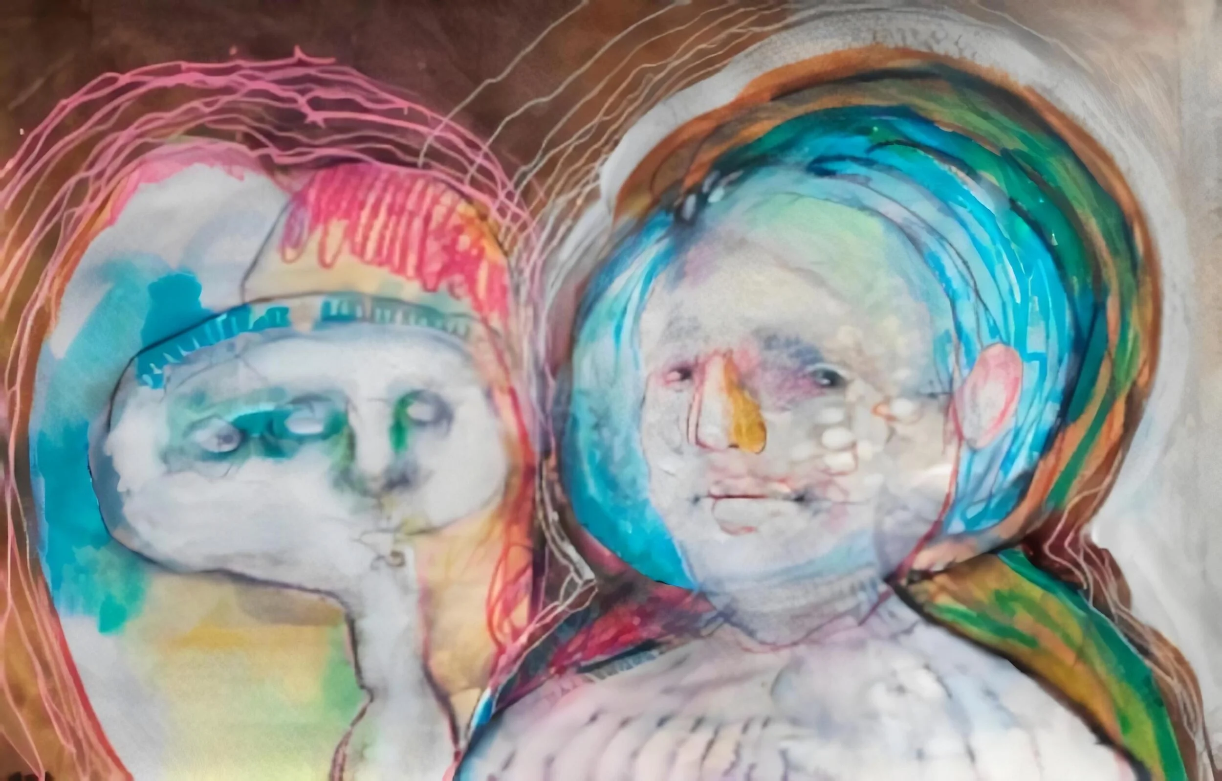 VENDIDO "El observador de sonidos, de la serie "Violines," 2020 Gráfica intervenida con pintura acrílica y lápices de colores / papel de algodón 25 x 17 cm