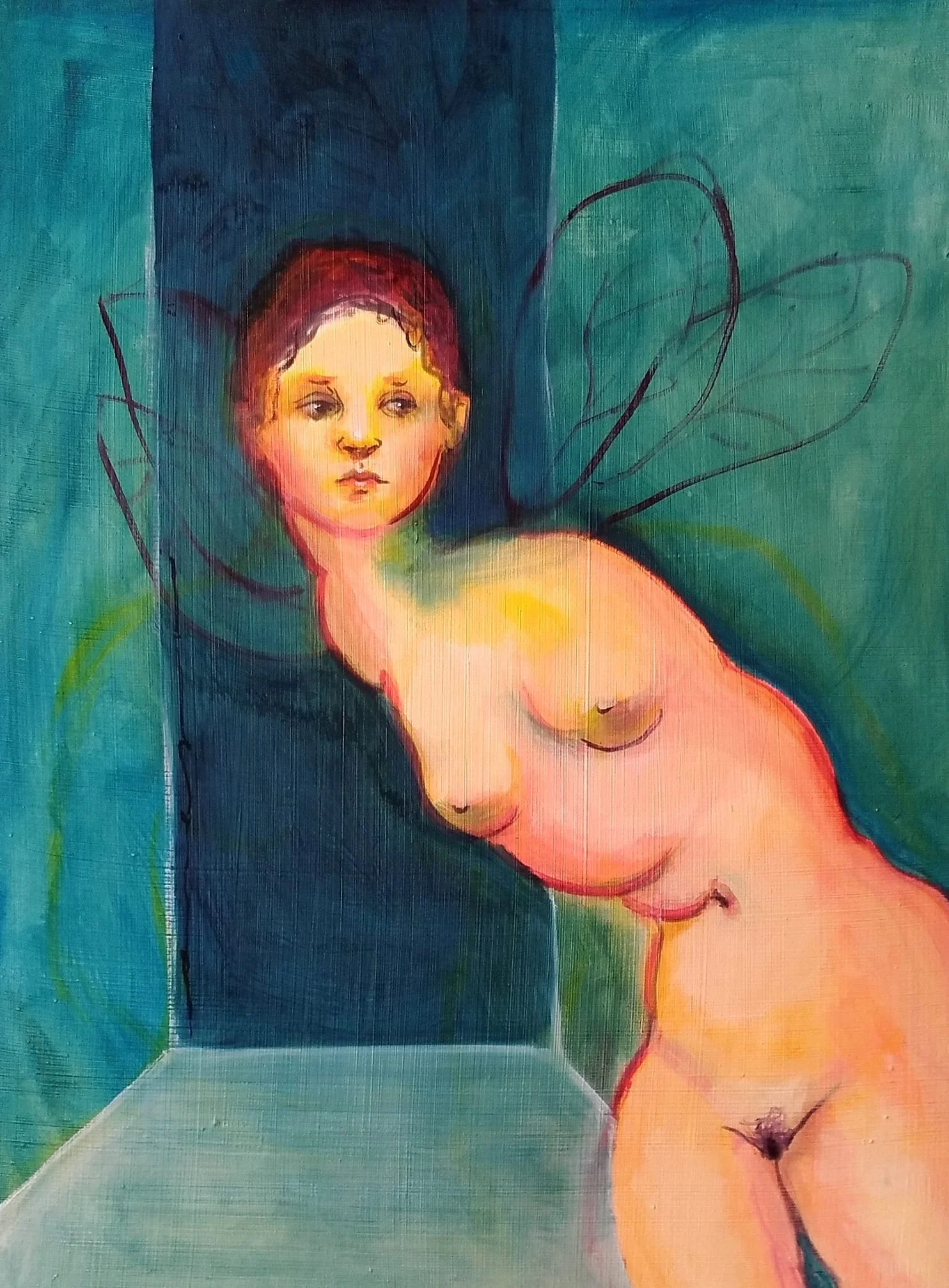 VENDIDO "Insecta", de la serie "Adolescencia para Sebastián," 2021. Óleo sobre madera 40x30cm