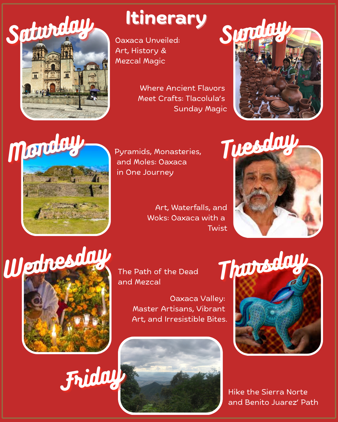 What to expect? Each day reveals a new side of Oaxaca and its surroundings. Start with a traditional breakfast, then dive into bustling markets, artisan studios, world-class museums, indigenous homes, and ancient ruins. Hike through the Sierra Norte, uncover living traditions, and savor one of the world’s most vibrant cuisines—with the chance to learn how to make it yourself. Evenings are yours to wander, sip mezcal, and soak up Oaxaca’s endless charms.